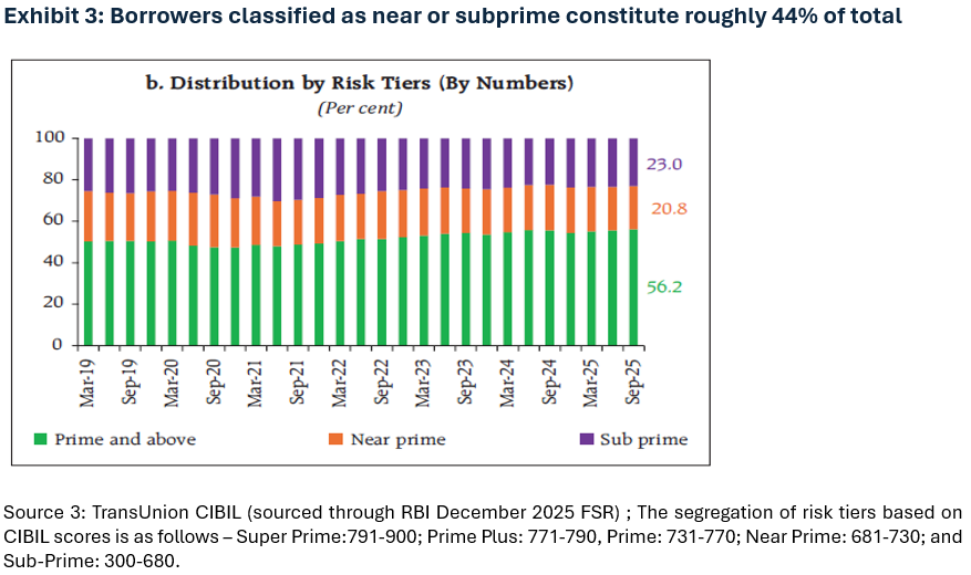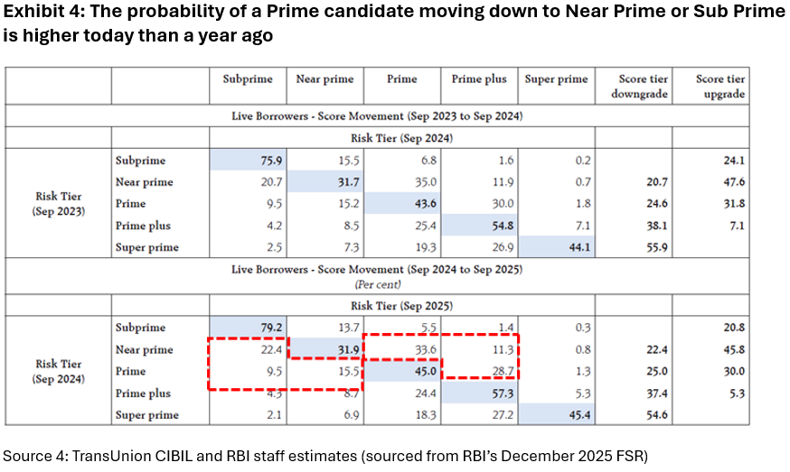 This trend, which has continued into FY26, has a further wrinkle in it. The percentage of near prime or subprime borrowers by number in total borrowers is 44%. The RBI has also included a transition matrix for different classes of borrowers (i.e., the probability of a prime customer going to near prime, subprime, or going to prime plus and super prime). What this shows is that the probability of a down-shift in credit scores is high and rising i.e., year on year, the probability of credit scores deteriorating is rising – see Exhibit 4 to understand this wrinkle.