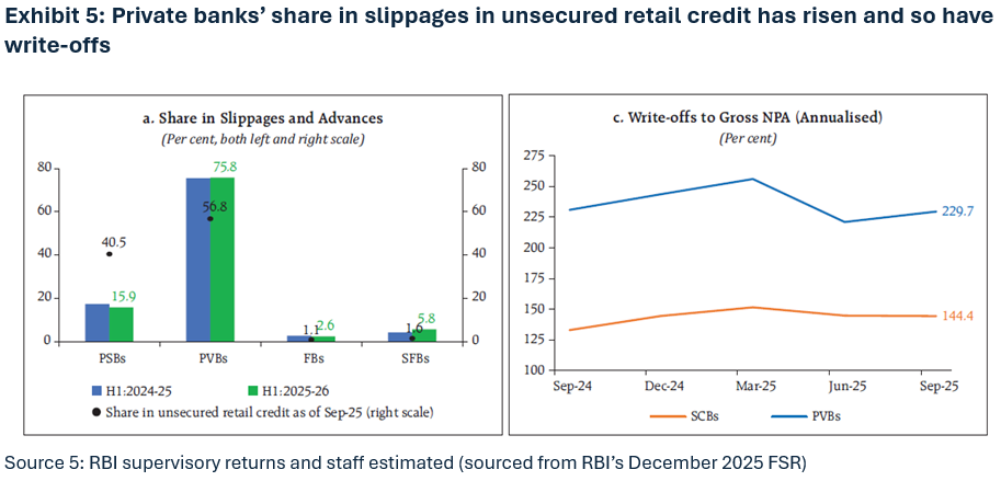 - Higher write-offs and rising slippages for private banks and NBFCs respectively.
