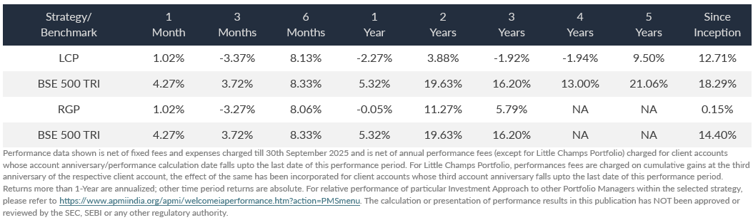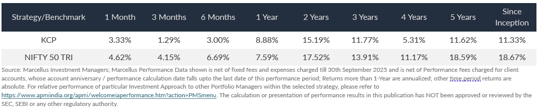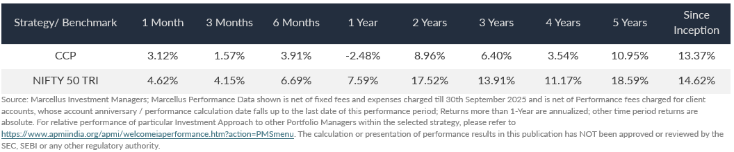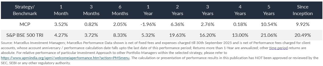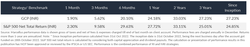 Global Compounders Portfolio (GCP) is a strategy offered by GIFT City branch of Marcellus Investment Managers Private Limited and the other strategies are offered by Marcellus Investment Managers Private Limited.